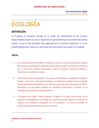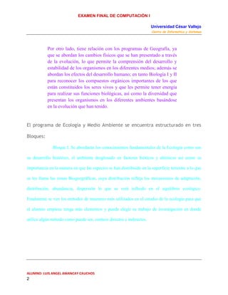 El documento detalla el programa de estudios de ecología en la Universidad César Vallejo, enfatizando su importancia en la formación académica y la solución de problemas ambientales. Se estructuran los contenidos en tres bloques que abarcan conceptos fundamentales de la ecología, la relación entre comunidades biológicas y su entorno, y el impacto del ser humano en los sistemas naturales. El objetivo es que los estudiantes desarrollen habilidades para proponer soluciones sostenibles a problemáticas ambientales locales y globales.