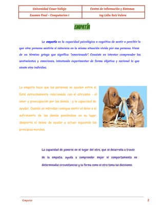 1) El documento habla sobre la empatía, que es la capacidad de ponerse en el lugar del otro y comprender sus sentimientos y emociones. La empatía permite ayudar a los demás y tener mejores relaciones interpersonales.