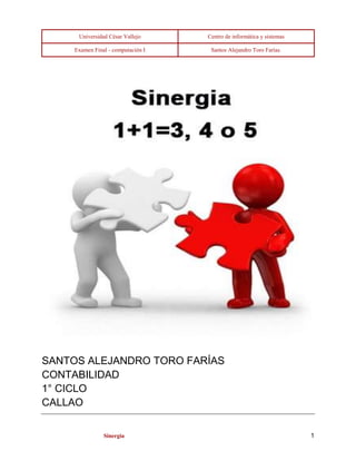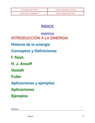 El documento presenta una introducción a la sinergia, definiendo el término como el efecto adicional que se obtiene cuando dos o más organismos trabajan juntos de forma coordinada, logrando resultados mayores que la suma de sus partes individuales. Explica brevemente la historia del concepto y ofrece definiciones de sinergia según diferentes autores. También incluye algunos ejemplos como el fuego, la vida celular y un neonato para ilustrar el principio de sinergia.