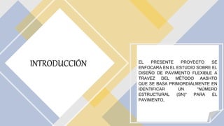 El documento presenta el estudio del diseño de un pavimento flexible mediante el método AASHTO. Se realizaron estudios geotécnicos para caracterizar el suelo y determinar los espesores requeridos de las capas del pavimento (carpeta asfáltica, base y sub-base). Se calculó el número estructural para cada capa y el conjunto de capas mediante el método AASHTO-93, lo que permitió definir los espesores mínimos requeridos para cada capa del pavimento flexible.