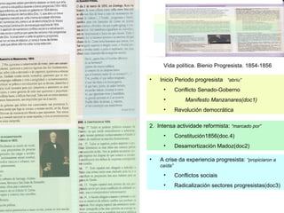 El documento describe el periodo progresista en España entre 1854-1856, un tiempo de intensa actividad reformista que incluyó la Constitución de 1856, la desamortización de Madoz y conflictos sociales que llevaron a la caída de la experiencia progresista.