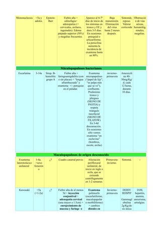 Este documento resume las principales características clínicas de varias enfermedades que se manifiestan con exantema, incluyendo la edad típica de aparición, etiología, descripción del exantema, periodo de transmisibilidad y tratamiento recomendado. Las enfermedades discutidas incluyen sarampión, rubeola, varicela, escarlatina, exantema de Kawasaki y exantema laterotorácico unilateral. El documento también provee detalles sobre el tratamiento con aciclovir para varic