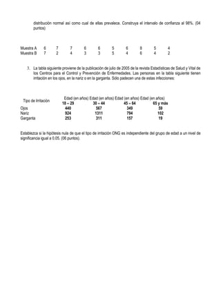 Este documento presenta un examen parcial de estadística aplicada que contiene 3 preguntas. La primera pregunta pide calcular porcentajes asumiendo una distribución normal del colesterol en hombres. La segunda pregunta presenta 2 muestras y pide establecer hipótesis y construir un intervalo de confianza. La tercera pregunta presenta datos sobre irritaciones y pide establecer la independencia con respecto a grupos de edad.