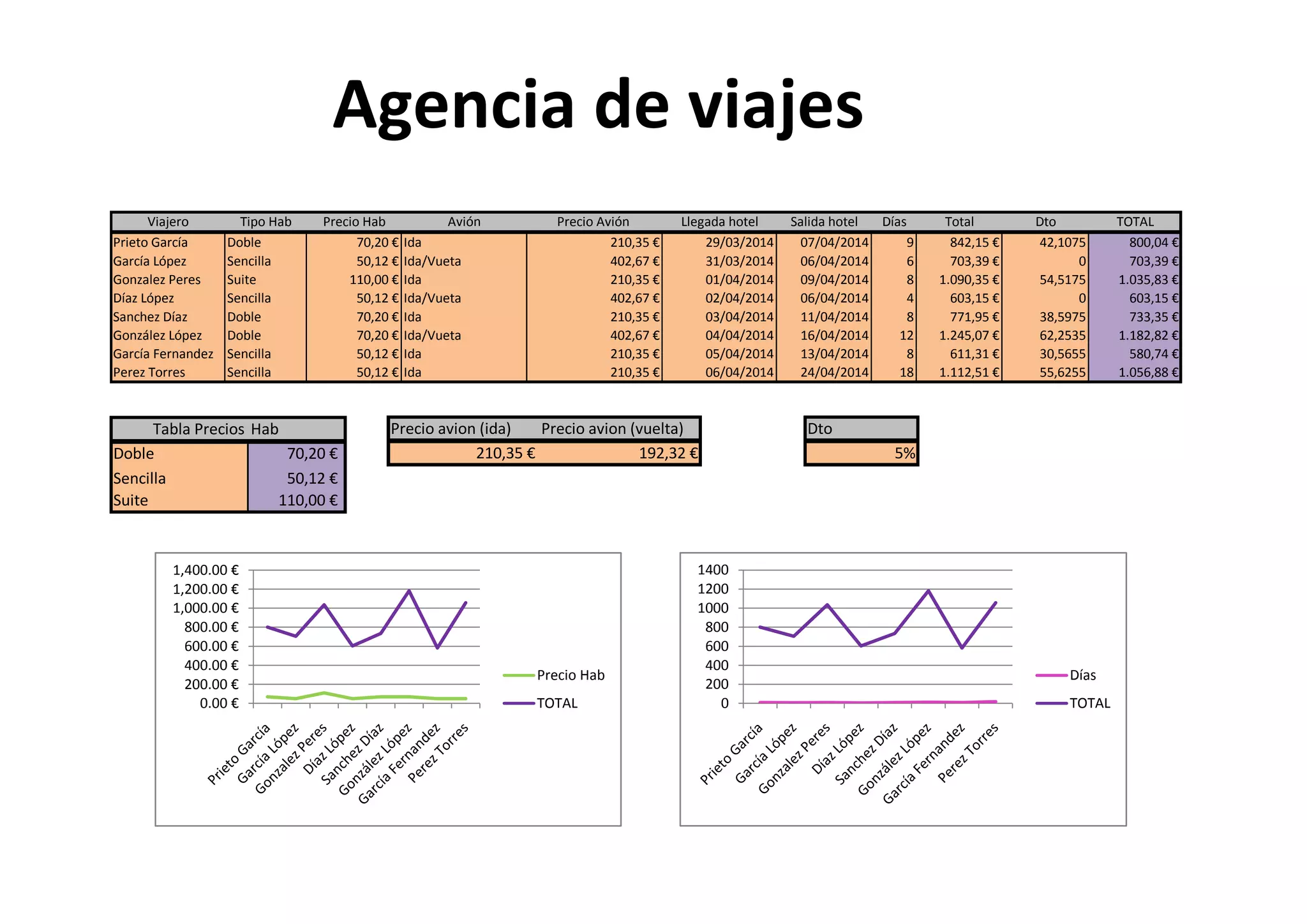 La tabla resume los detalles de 8 viajes diferentes incluyendo el nombre del pasajero, tipo de habitación, precios de habitación y vuelo, fechas de llegada y salida al hotel, número de días y el total del viaje con y sin descuento. La tabla también incluye los precios por habitación doble, sencilla o suite así como los precios de vuelo de ida y vuelta de la agencia de viajes.