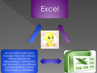 Excel es un programa de hojas de cálculo desarrollado por Microsoft que se utiliza comúnmente para tareas financieras y de contabilidad. Puede usarse para áreas como economía, biología, matemáticas y recursos humanos. Excel permite importar y analizar grandes conjuntos de datos, y miles de millones de dólares y decisiones dependen de este programa.
