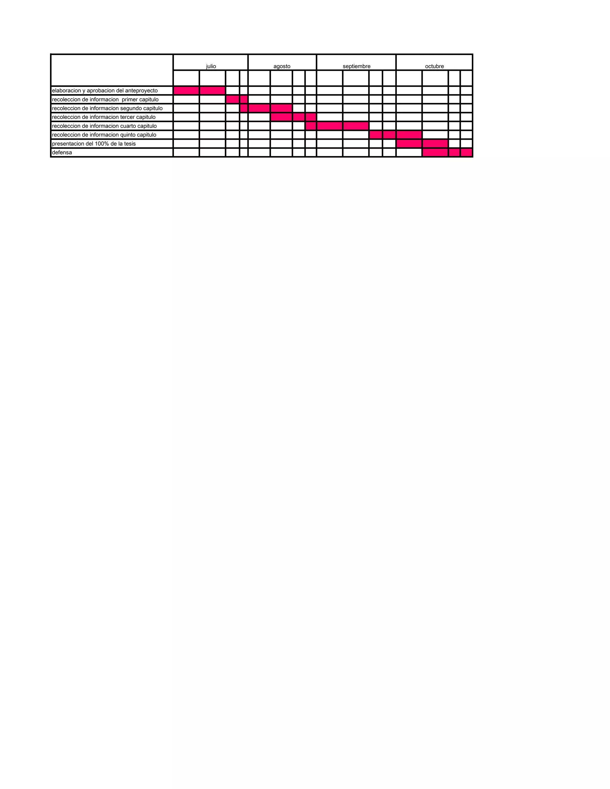 Este cronograma detalla las etapas de elaboración de una tesis desde julio hasta octubre, incluyendo la elaboración y aprobación del anteproyecto, la recolección de información para los cinco capítulos de la tesis, y la presentación y defensa del 100% de la tesis en octubre.
