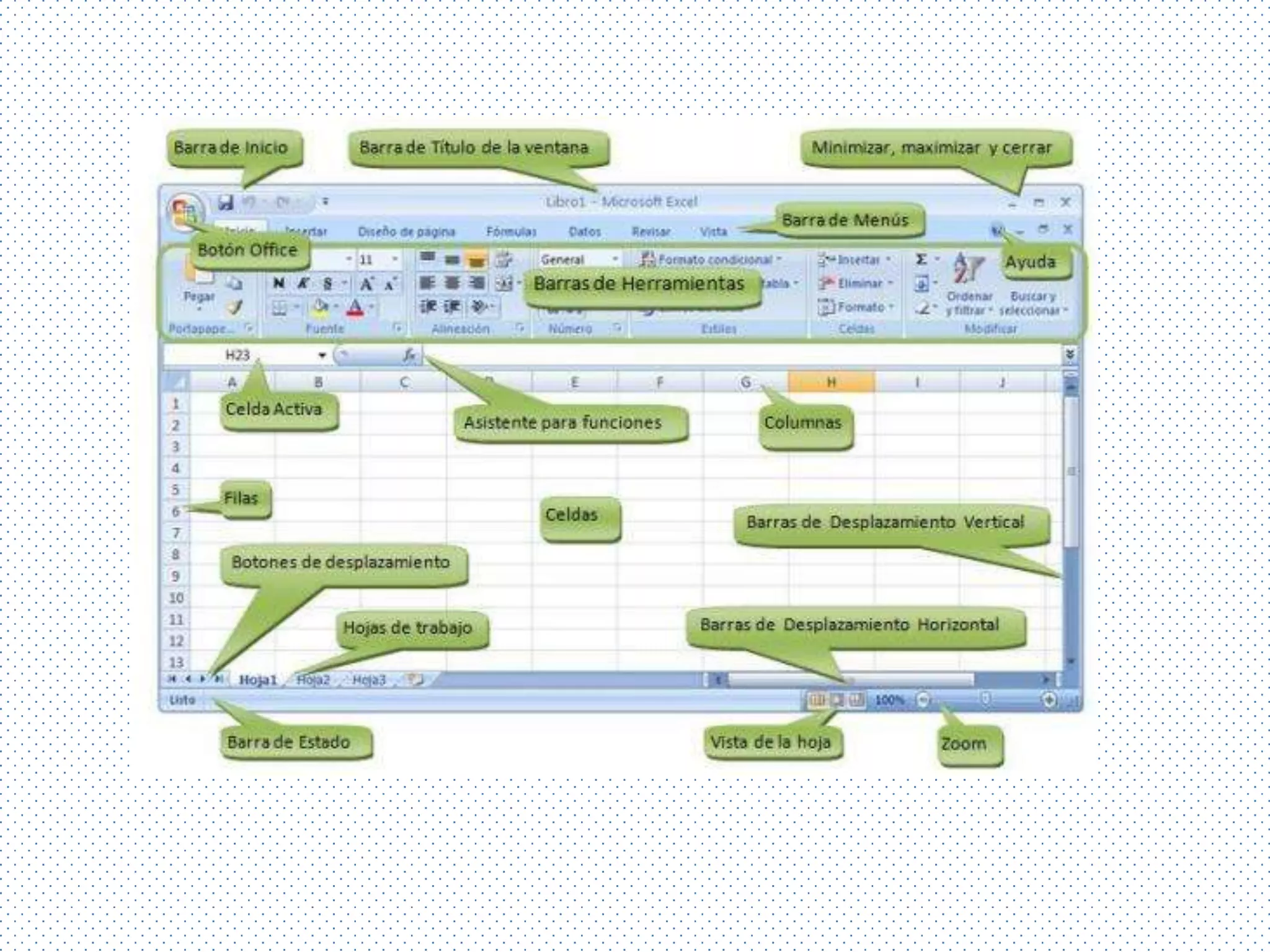 Las principales barras y áreas de Excel son: 1) la barra de título que muestra el nombre del programa y archivo; 2) la barra de menús con opciones organizadas por categorías; 3) las barras de herramientas con iconos para comandos comunes; 4) la barra de fórmulas que muestra el contenido de la celda activa; 5) el área de trabajo compuesta por celdas organizadas en filas y columnas; y 6) las barras de desplazamiento horizontal y vertical para moverse dentro de la hoja de cálculo.