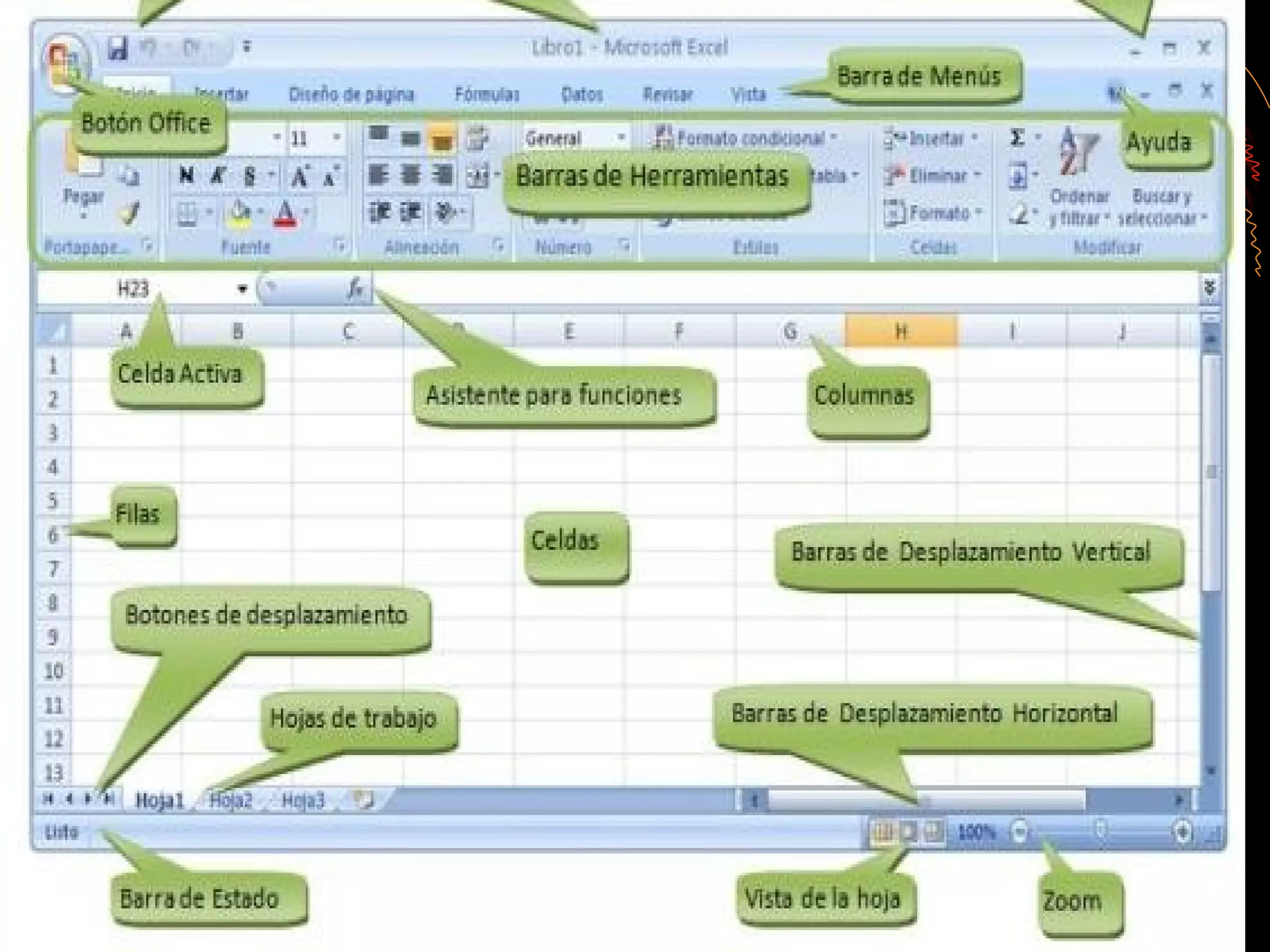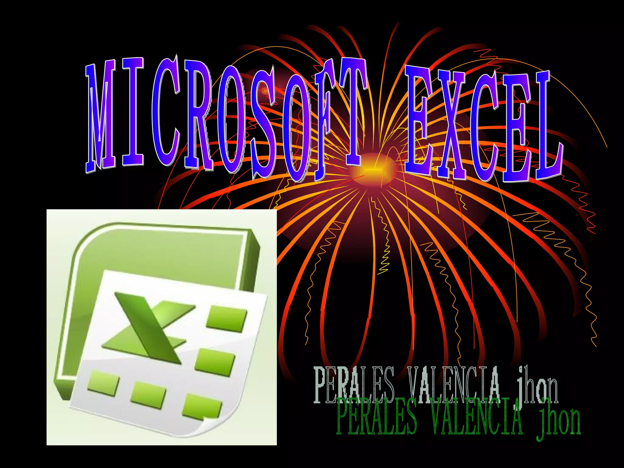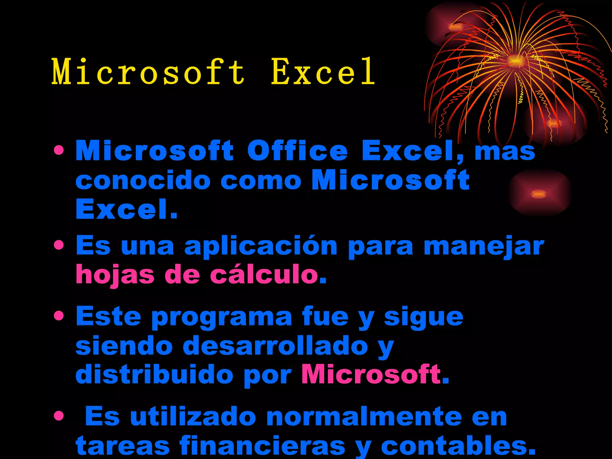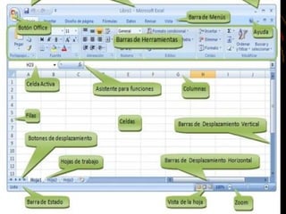 Microsoft Excel es una aplicación de hojas de cálculo desarrollada por Microsoft que permite manipular datos numéricos y alfanuméricos en tablas, realizar cálculos complejos con fórmulas y funciones, y crear gráficas. La pantalla de Excel contiene elementos como la barra de título, menús, celdas de trabajo, barras de desplazamiento y zoom, y permite ver y modificar múltiples hojas de cálculo. Excel se usa comúnmente para tareas financieras y contables.