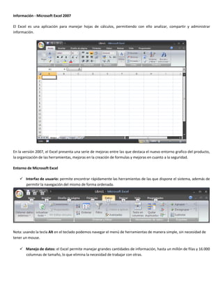 El documento describe las mejoras en Microsoft Excel 2007, incluyendo una nueva interfaz de usuario que facilita la navegación de herramientas, la capacidad de manejar grandes cantidades de datos, mejoras en el manejo de tablas y compatibilidad con SQL Server 2005 para crear informes personalizados desde una base de datos. Excel 2007 también permite compartir hojas de cálculo a través de la web y convertir archivos a formatos como XPS y PDF.