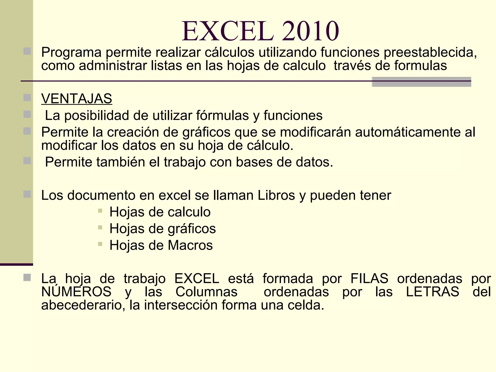Excel 2010 permite realizar cálculos a través de fórmulas y funciones predefinidas. Los documentos de Excel, llamados libros, contienen hojas de cálculo, gráficos y macros. Las hojas de cálculo están formadas por filas y columnas donde cada intersección forma una celda que puede contener fórmulas, funciones u otros datos. Excel permite crear fórmulas con operadores aritméticos, de comparación y referencias a celdas para automatizar cálculos que se actualizan cuando cambian los datos. También incluye func