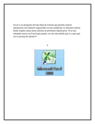 Este documento proporciona una introducción a los elementos básicos de Excel, incluyendo cómo iniciar el programa, navegar por hojas y celdas, introducir y modificar datos, y realizar operaciones básicas con archivos como guardar, abrir, crear nuevos y cerrar libros de trabajo. El documento está dirigido por el profesor John Alexander Caraballo en el Colegio Nacional Nicolás Esguerra.