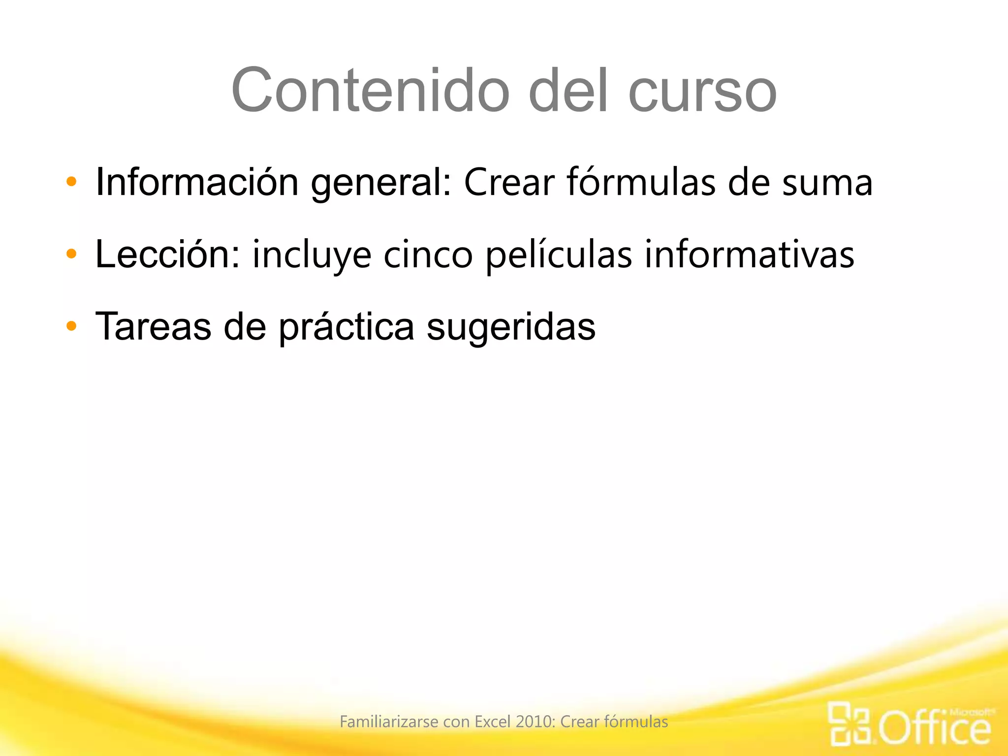 Este documento presenta un curso sobre cómo crear fórmulas en Microsoft Excel 2010. El curso incluye cinco videos informativos sobre sumas, referencias de celdas, funciones SUM y PROMEDIO. El objetivo es que los estudiantes aprendan a realizar cálculos básicos, actualizar automáticamente los resultados de las fórmulas y usar funciones predefinidas.
