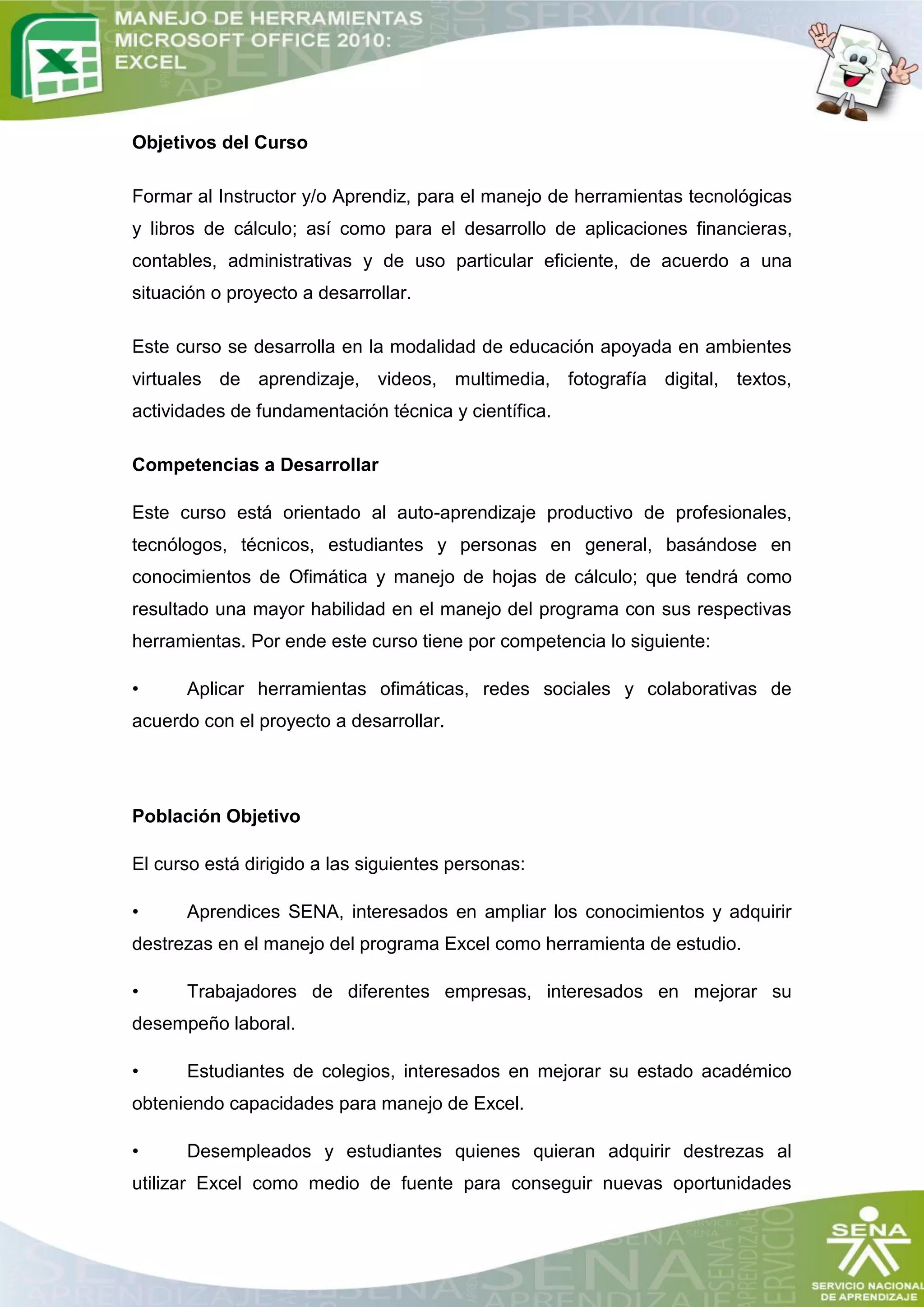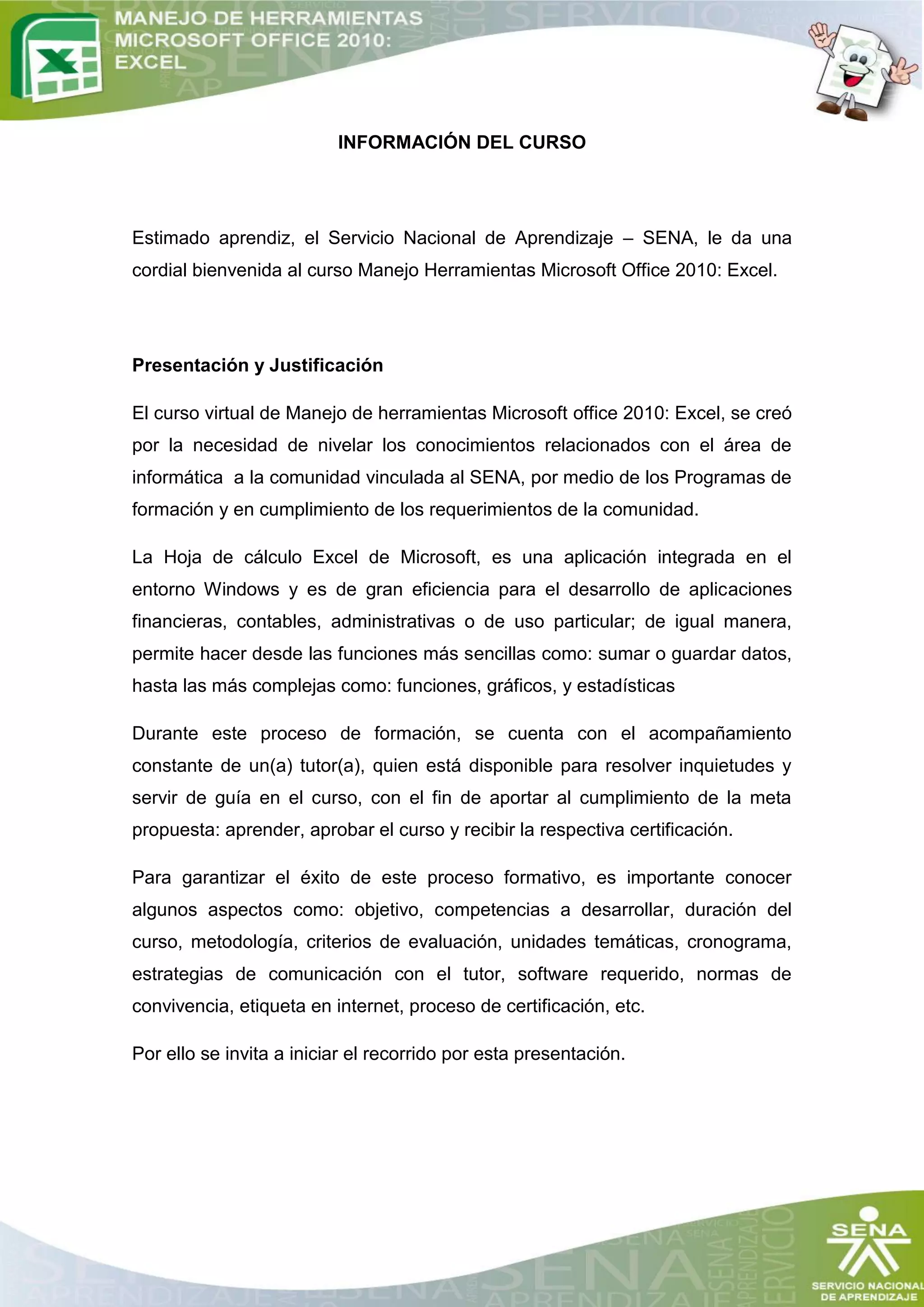 Este documento presenta la información sobre un curso virtual de Manejo de herramientas Microsoft office 2010: Excel ofrecido por el Servicio Nacional de Aprendizaje (SENA). El curso enseña el uso de Excel para aplicaciones financieras, contables y administrativas. El curso dura 40 horas y cubre temas como funciones básicas de Excel, gráficos, tablas dinámicas y macros. Los aprendices recibirán una certificación después de completar con éxito el curso.