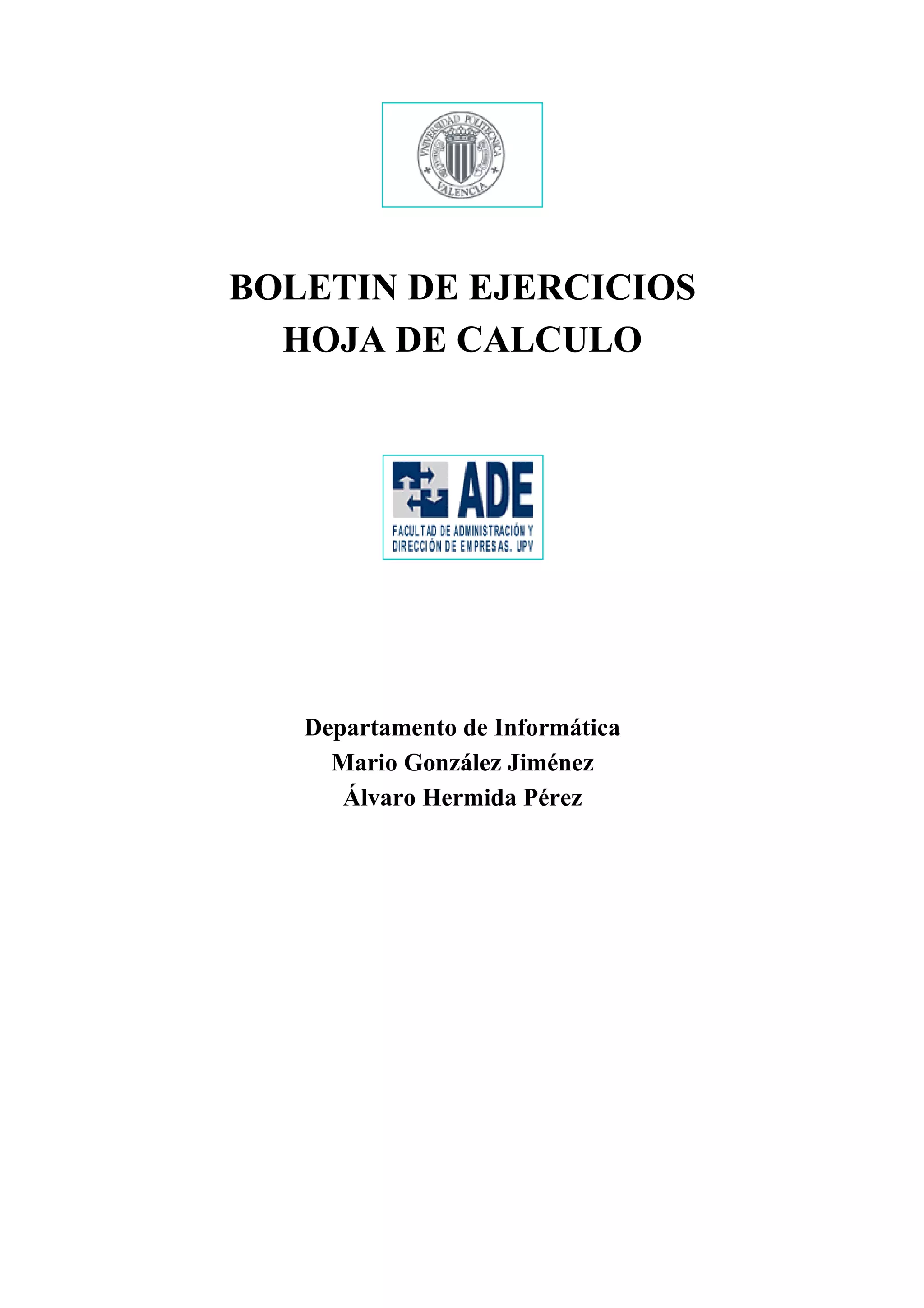 Este documento presenta 8 ejercicios de hoja de cálculo sobre diferentes temas como cálculos de ventas, facturas, sueldos, importaciones y exportaciones. Cada ejercicio describe los objetivos, los datos de entrada y los cálculos y resultados esperados.