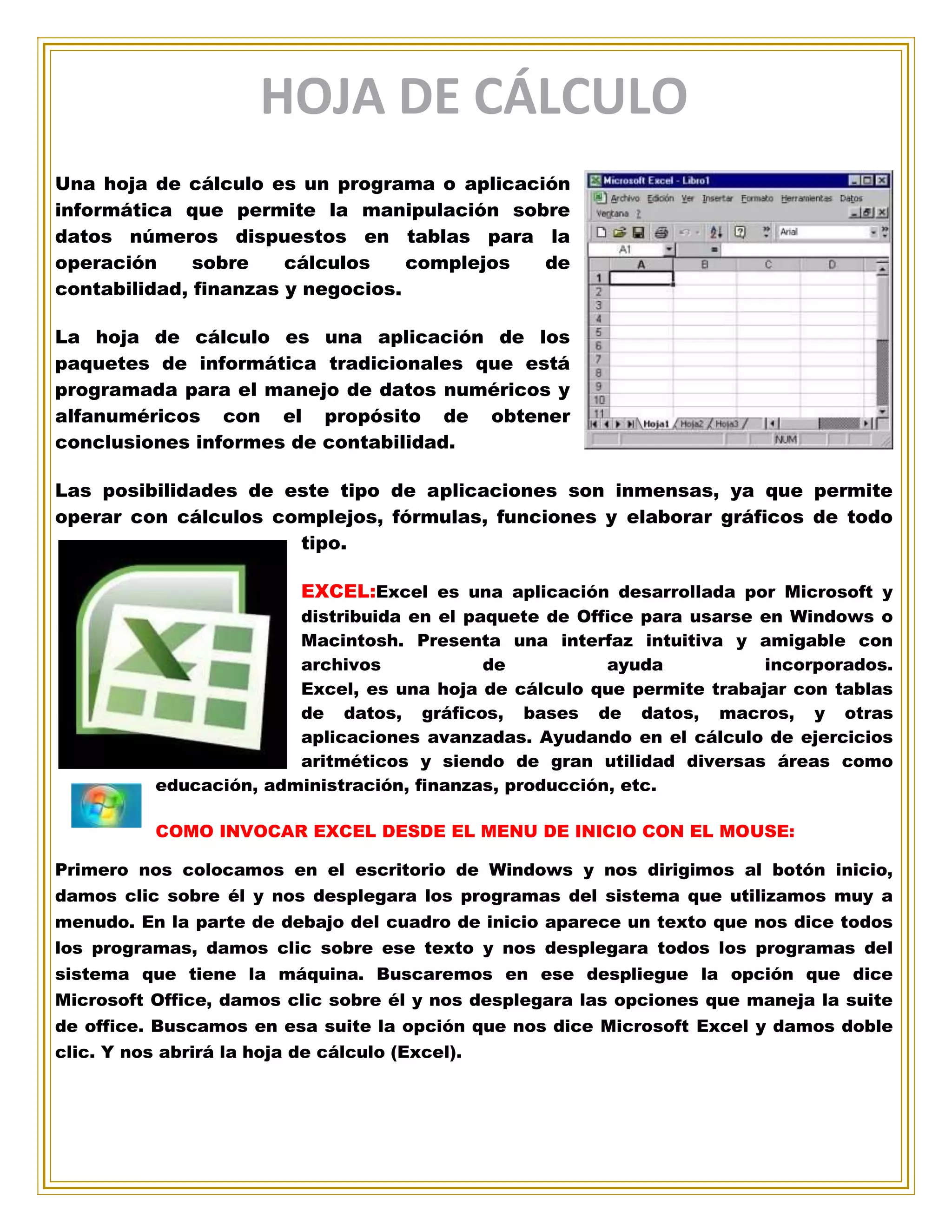 Excel es una hoja de cálculo desarrollada por Microsoft que permite manipular datos numéricos y alfanuméricos en tablas para realizar cálculos complejos. Se puede abrir Excel desde el menú de inicio del sistema haciendo clic en el botón inicio, luego en Microsoft Office y finalmente en Excel, o escribiendo "Excel" en el punto de inserción del comando. Excel presenta una interfaz amigable para trabajar con tablas, gráficos, bases de datos y macros.