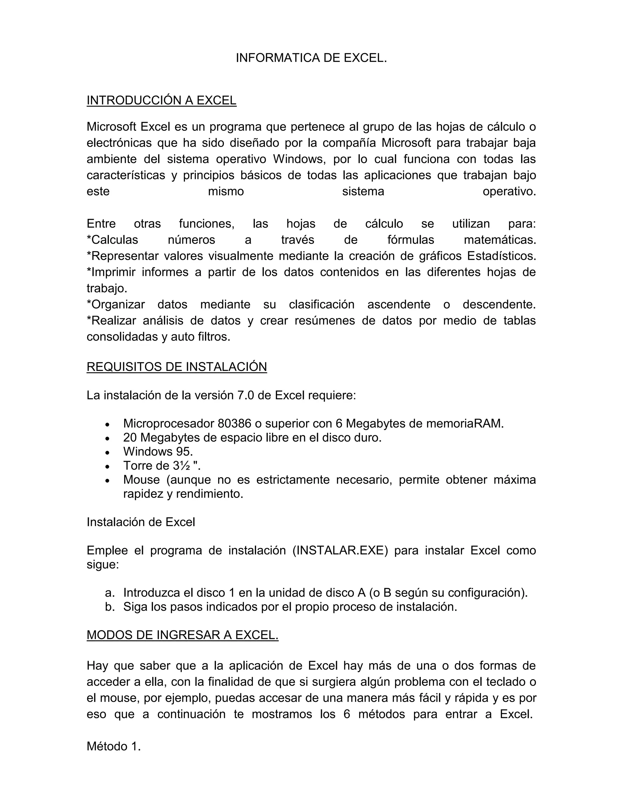 Este documento proporciona una introducción a Microsoft Excel, incluyendo sus funciones principales, requisitos de instalación, modos de acceso, entorno de trabajo y elementos básicos. Excel se utiliza principalmente para realizar cálculos numéricos, representar datos gráficamente, organizar información y analizar datos.