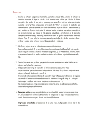 Excel permite crear tablas (planillas) con celdas, filas y columnas para almacenar y calcular datos numéricos de forma automática. Las celdas pueden contener valores constantes como números, fechas u texto. Las funciones como suma, producto, máximo, mínimo y promedio realizan cálculos matemáticos en rangos de celdas. La planilla de ejemplo muestra cómo usar estas funciones para sumar, multiplicar, dividir, restar y obtener valores estadísticos de los datos.