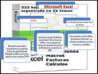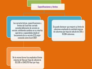 El documento lista las versiones de Microsoft Excel lanzadas desde 1987 hasta 2010, identificando el año de lanzamiento y la versión de Office con la que fue lanzada cada versión de Excel.