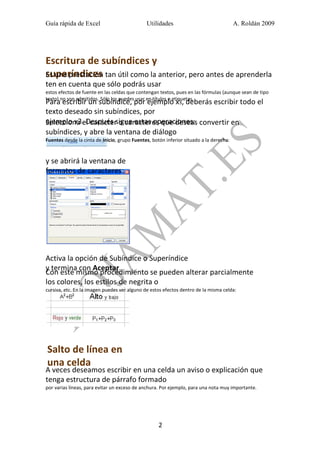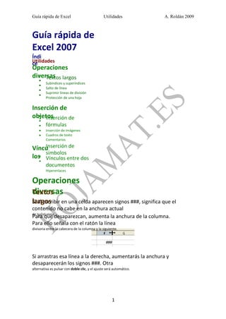 Este documento proporciona una guía rápida de Excel con instrucciones sobre varias utilidades como ampliar el ancho de columnas para mostrar texto completo, escribir subíndices y superíndices, incluir saltos de línea dentro de celdas, ocultar líneas divisorias, proteger hojas, insertar imágenes, cuadros de texto, comentarios, símbolos especiales y vincular objetos entre documentos. Explica cómo realizar cada una de estas tareas de forma concisa y paso a paso.