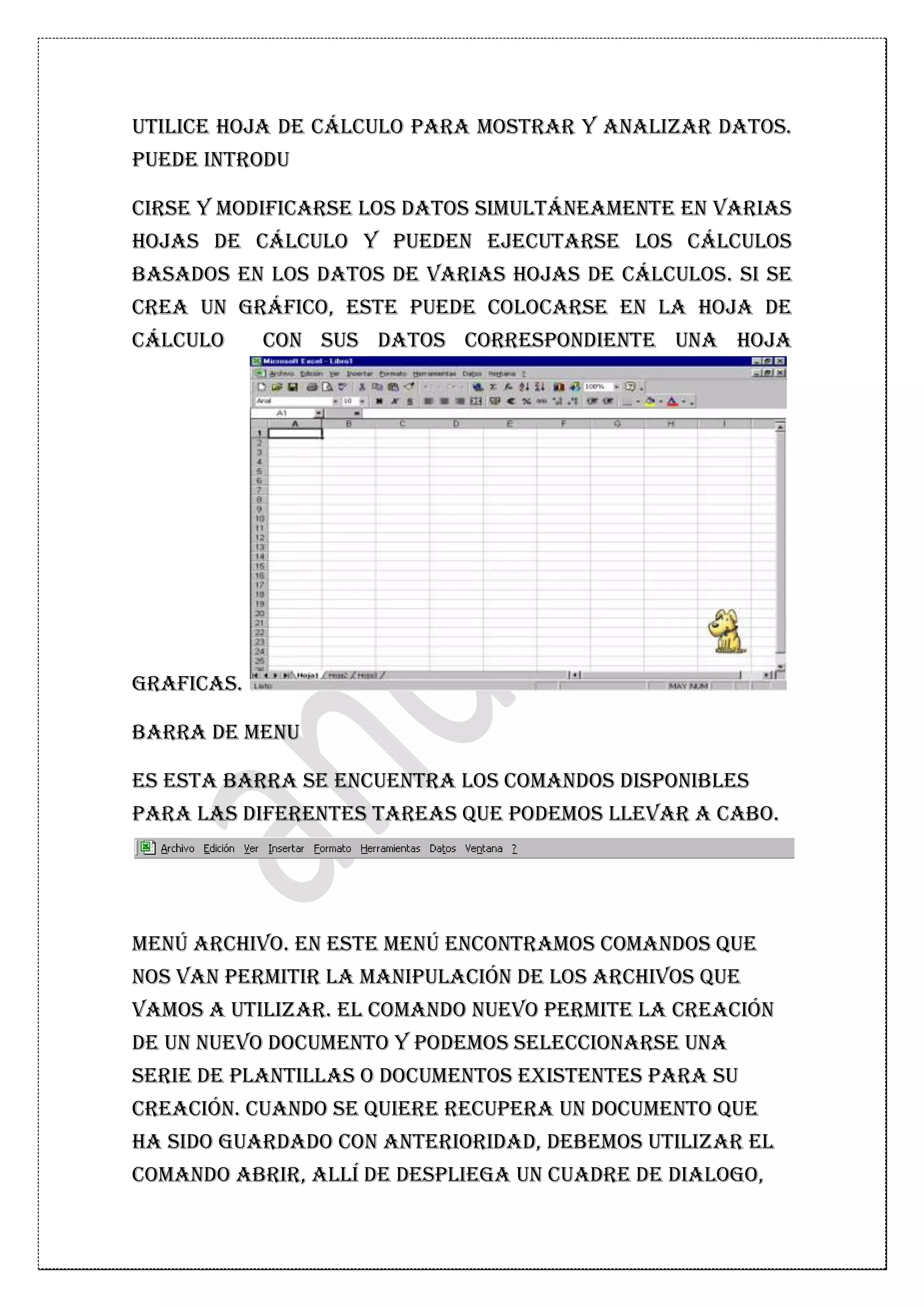 Excel es una hoja de cálculo que permite introducir y modificar datos en múltiples hojas, y realizar cálculos basados en los datos. Contiene menús para archivos, edición, vista, inserción, formato, herramientas y datos que facilitan la manipulación de la información. Se pueden crear gráficos a partir de los datos y moverlos entre hojas. Las fórmulas y funciones permiten realizar cálculos aritméticos con la información.