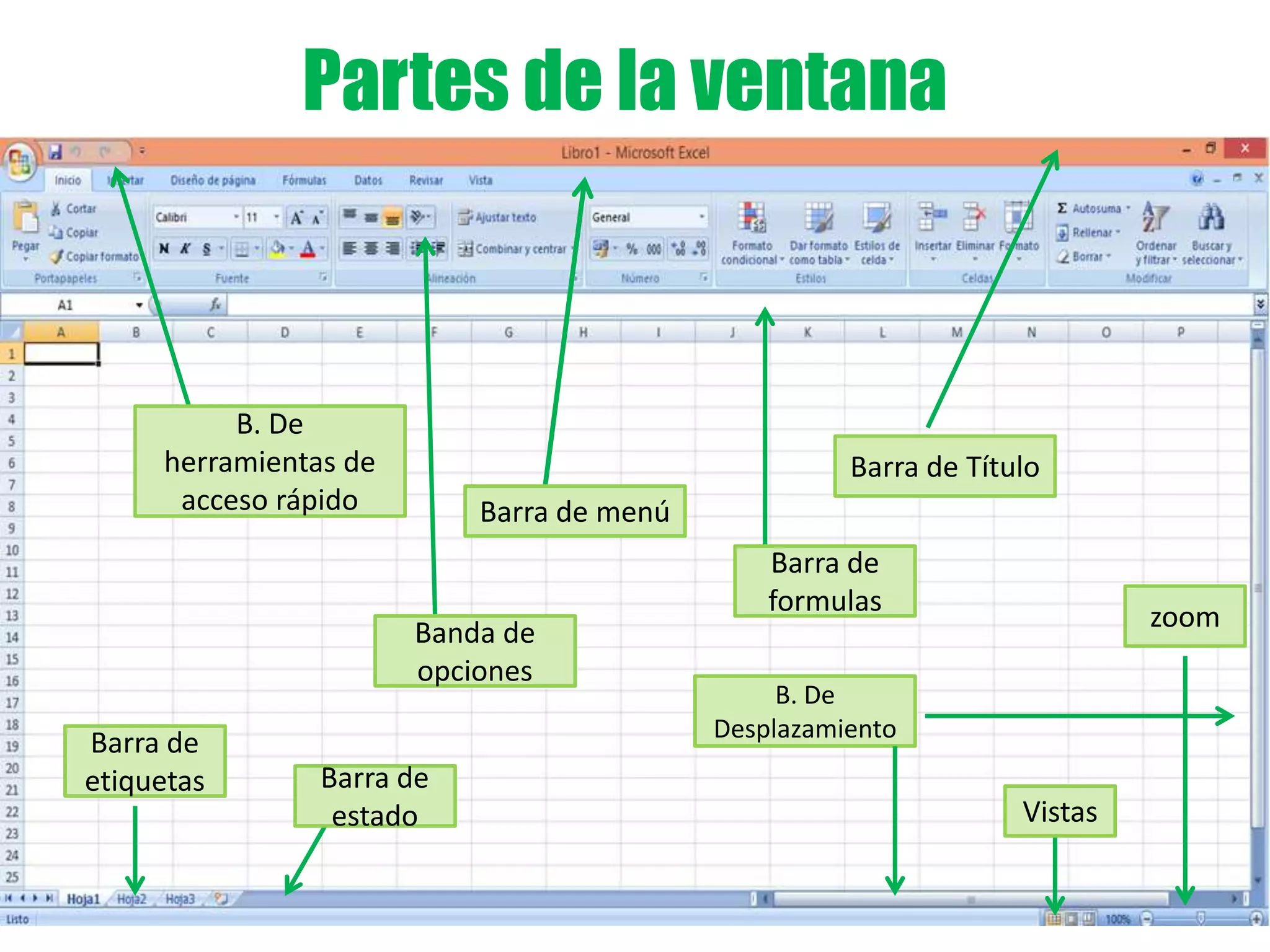 Excel tiene varias barras y herramientas que permiten navegar y editar hojas de cálculo. La barra de título muestra el nombre del archivo, la barra de menús ofrece opciones como abrir y guardar, y la barra de herramientas proporciona comandos comunes. Las hojas de cálculo contienen celdas organizadas en filas y columnas para almacenar y calcular datos numéricos. Excel es una poderosa herramienta para trabajar con números y fórmulas.