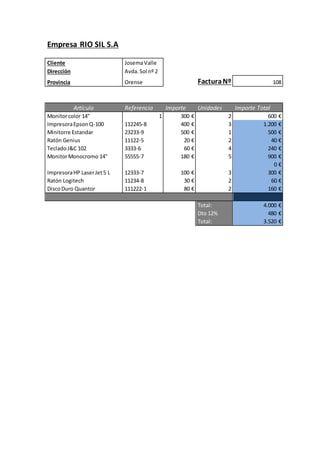 La empresa RIO SIL S.A. emitió una factura al cliente Josema Valle por un total de 3.520 euros después de aplicar un descuento del 12% por la compra de varios artículos electrónicos como monitores, impresoras, una torre, ratones, teclados y un disco duro.