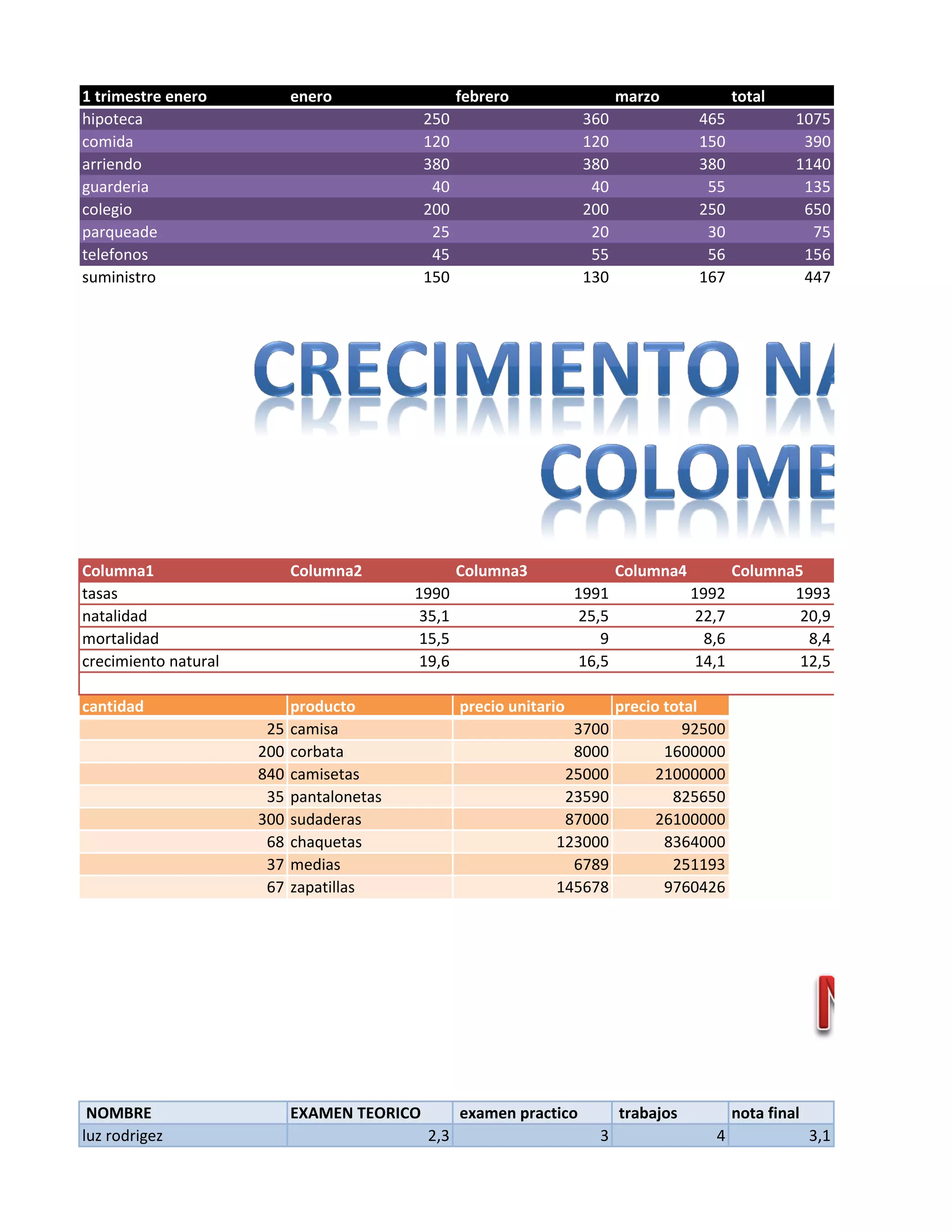El documento presenta los gastos mensuales de una familia durante el primer trimestre del año, incluyendo gastos como hipoteca, comida, arriendo, guardería, colegio, entre otros. También muestra las tasas de natalidad, mortalidad y crecimiento natural en Colombia entre 1990 y 1995, y los resultados de un examen de 11 estudiantes con sus notas en el examen teórico, práctico y trabajo final.
