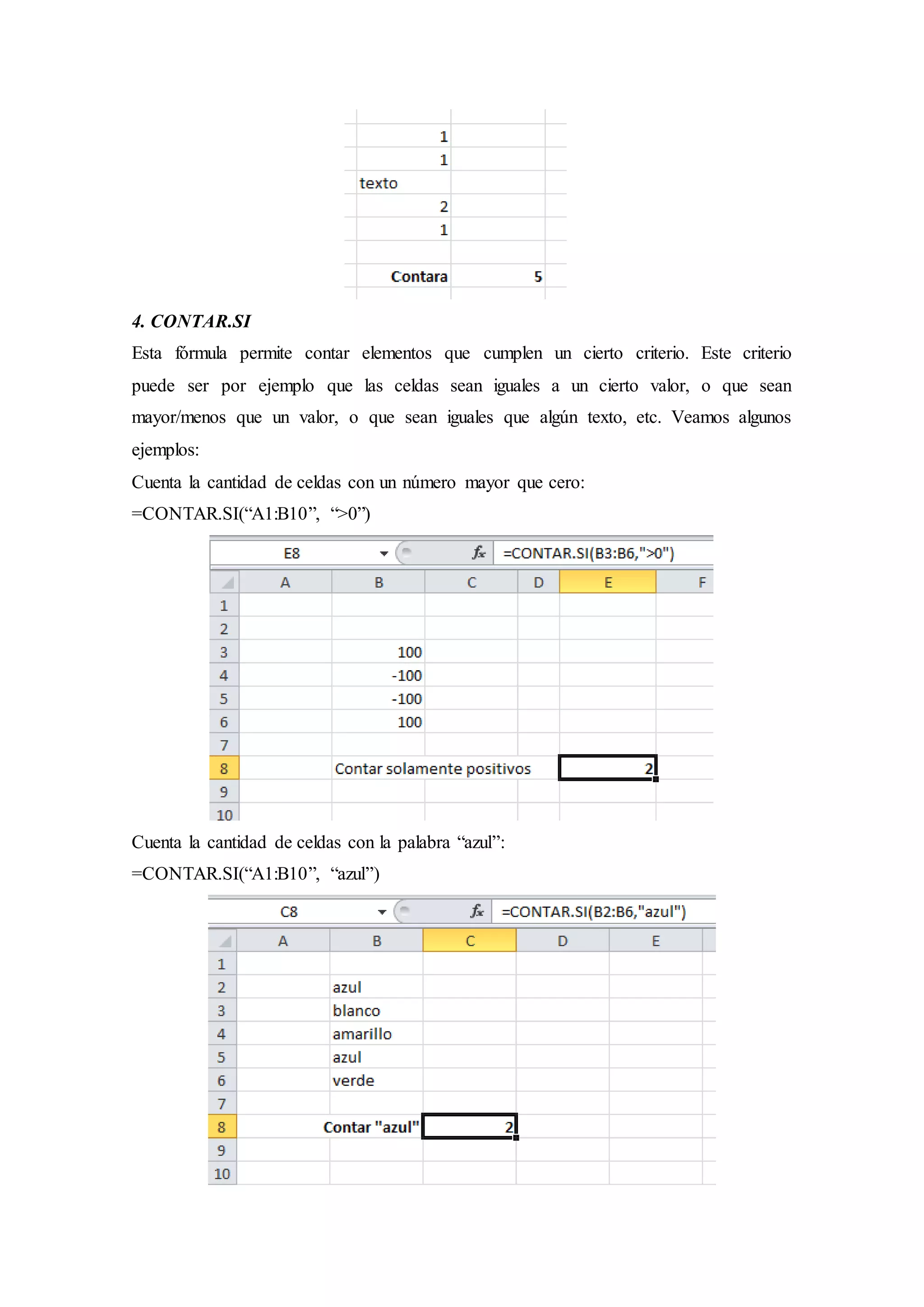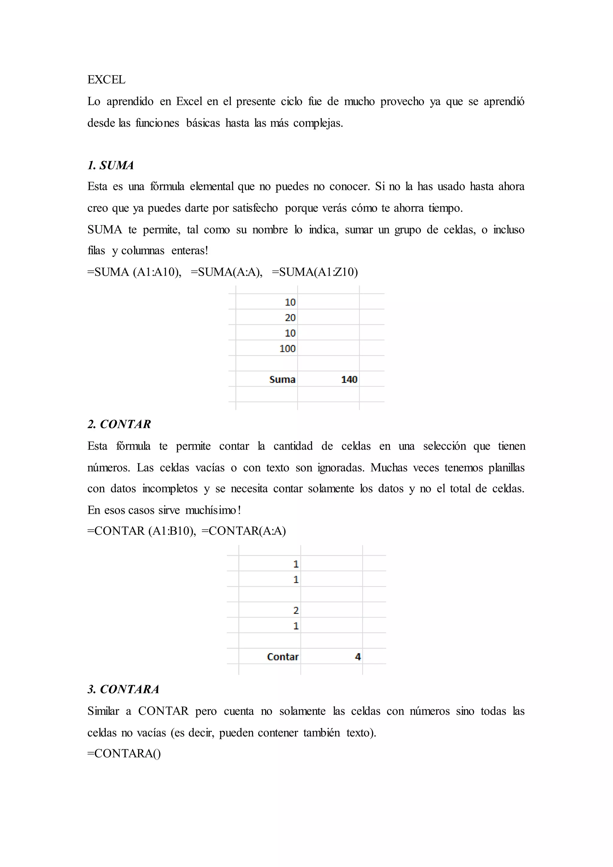 El documento resume 10 funciones útiles de Excel, incluyendo SUM, COUNT, IF, LOOKUP, SUMIF y RANDBETWEEN. Estas funciones permiten sumar, contar, buscar valores, aplicar condiciones y generar números aleatorios, lo que facilita tareas como analizar y manipular datos.