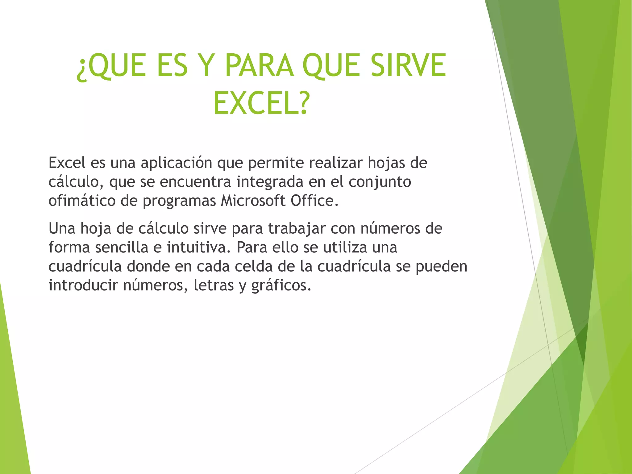Excel es una aplicación de hojas de cálculo que permite realizar cálculos numéricos de forma sencilla. Una hoja de cálculo contiene celdas organizadas en filas y columnas donde se pueden introducir números, letras y gráficos. Excel también permite crear gráficos para visualizar y analizar datos de forma gráfica.
