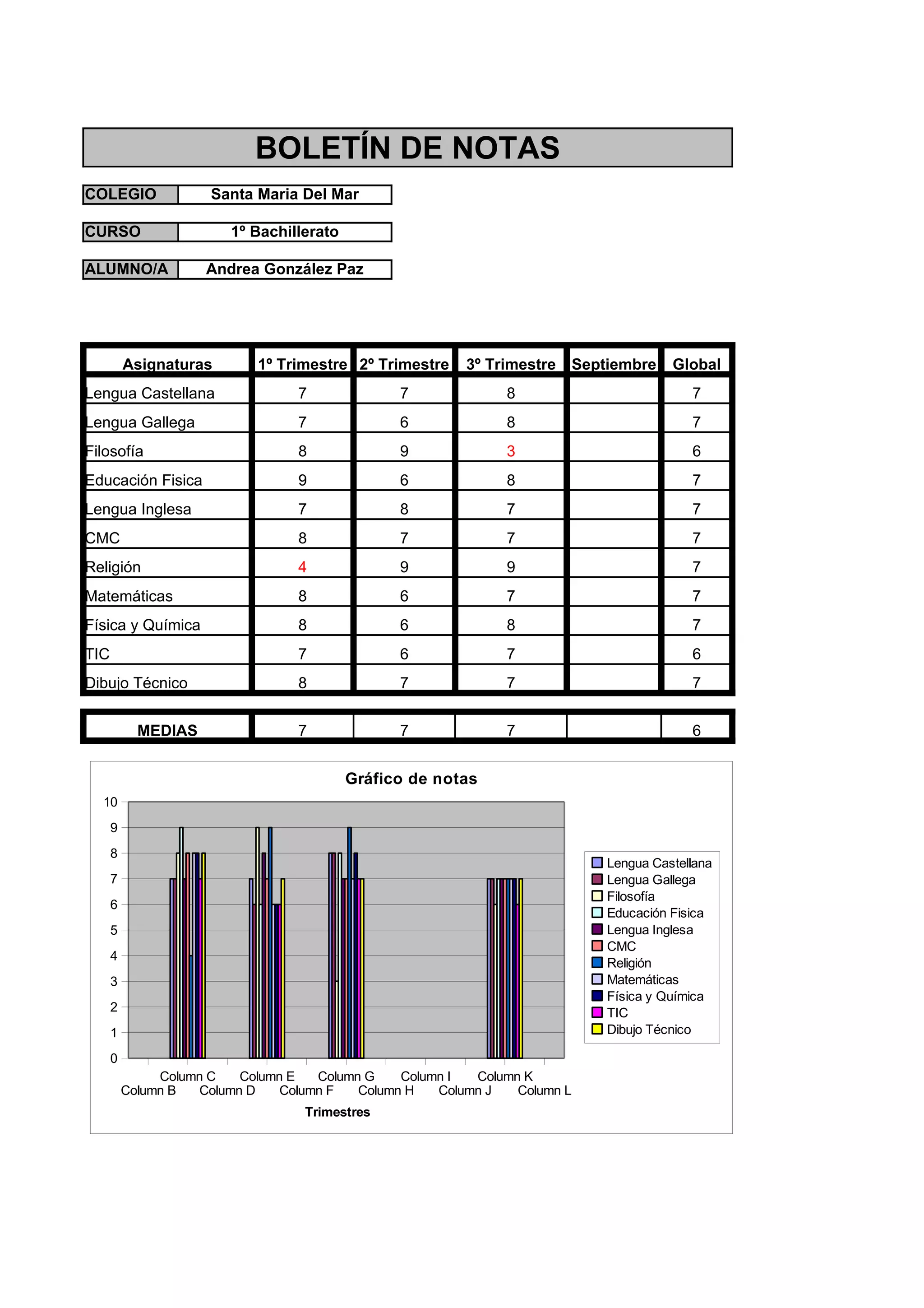 El boletín de notas muestra las calificaciones de Andrea González Paz en 1o de Bachillerato. Obtuvo una media general de 7, con sus mejores asignaturas siendo Lengua Castellana, Lengua Gallega y Física y Química, en las que consiguió notas de 7 o más.