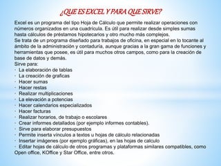 Excel es un programa de hoja de cálculo que permite realizar cálculos y operaciones con números organizados en una cuadrícula. Se utiliza comúnmente para tareas de oficina como elaborar presupuestos, facturas e informes. Dentro de Excel, un libro contiene una o más hojas de trabajo compuestas de filas, columnas y celdas donde se ingresan datos y fórmulas.