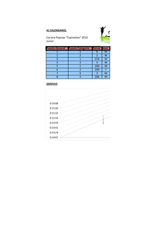 El documento presenta diferentes secciones con información sobre varios temas. Sección A muestra los resultados de una carrera popular, incluyendo el ranking y datos de los participantes. Sección B presenta un medallero deportivo de España en 2009 con datos sobre diferentes deportes. Sección C contiene notas de una asignatura universitaria.