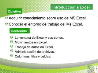 El documento describe el uso de Microsoft Excel, abarcando su entorno de trabajo, operaciones con datos y administración de archivos. Se explican conceptos clave como celdas, filas y columnas, así como técnicas para navegar dentro de la hoja de cálculo. Además, se detallan métodos para guardar y abrir libros de trabajo en Excel.