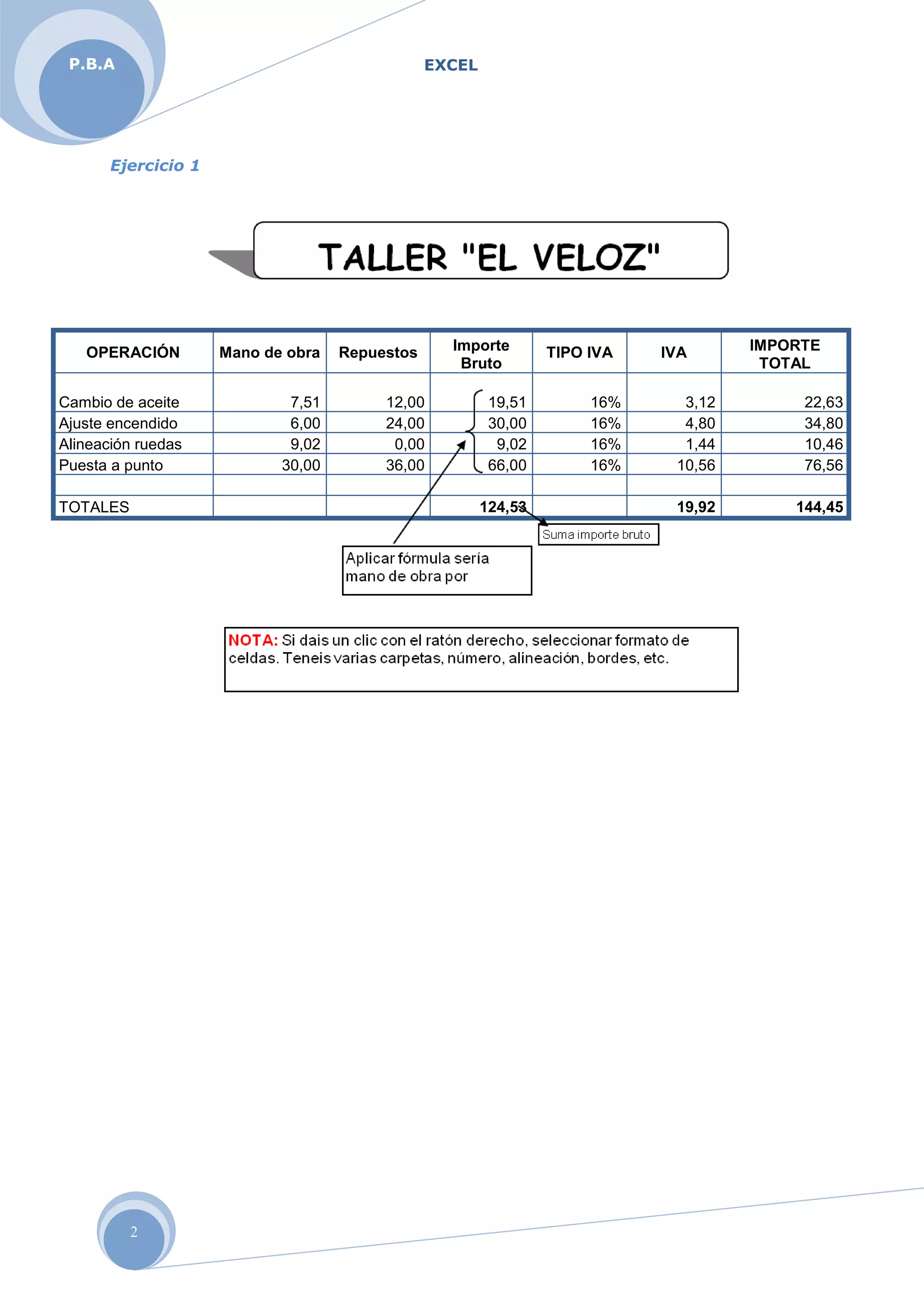 Este documento presenta una serie de ejercicios de nivel básico en Excel. El primer ejercicio muestra un presupuesto de reparaciones de un coche con diferentes operaciones, IVA e importe total. El segundo ejercicio es un presupuesto con descuento e IVA. El tercer ejercicio es otro presupuesto con diferentes artículos, cantidad, precio, importe bruto, descuento e IVA.