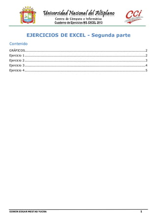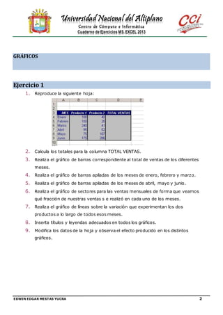 Este documento presenta una serie de ejercicios en Excel para crear diferentes tipos de gráficos a partir de datos. Los ejercicios incluyen la creación de gráficos de barras, líneas, sectores y dispersión para representar ventas mensuales, gastos publicitarios y funciones matemáticas. El objetivo es que los estudiantes aprendan a generar y personalizar gráficos dinámicos vinculados a datos en hojas de cálculo.