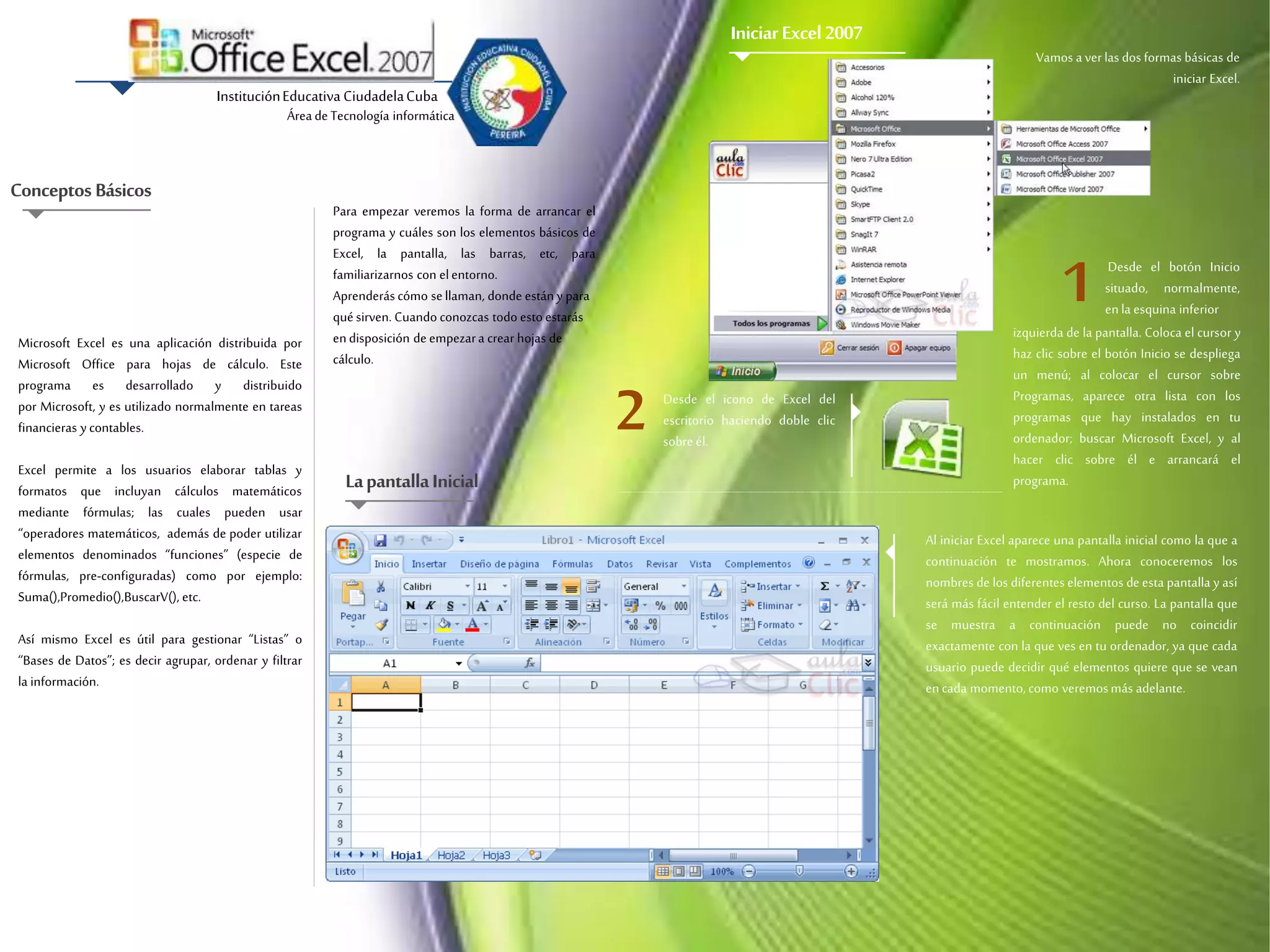 Microsoft Excel es una aplicación de hojas de cálculo desarrollada por Microsoft que se usa comúnmente para tareas financieras y contables. Excel permite crear tablas y formatos con fórmulas matemáticas y funciones predefinidas como suma, promedio y búsqueda. También es útil para organizar y filtrar listas de datos. El documento procede a explicar cómo iniciar Excel y los elementos básicos de su interfaz como barras y pantalla.