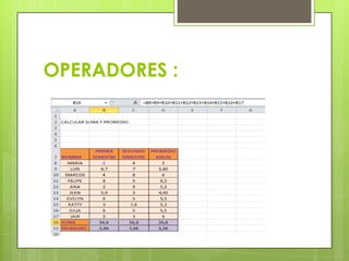 Este documento proporciona una introducción a los operadores y funciones en Excel. Explica que los operadores especifican el tipo de operación matemática como suma, resta, multiplicación y división que se realizará en Excel. También describe que las funciones son fórmulas predefinidas que permiten realizar cálculos como sumas de manera más rápida. Como ejemplo, explica cómo usar la función SUMA para sumar valores en lugar de escribir manualmente la fórmula de suma.