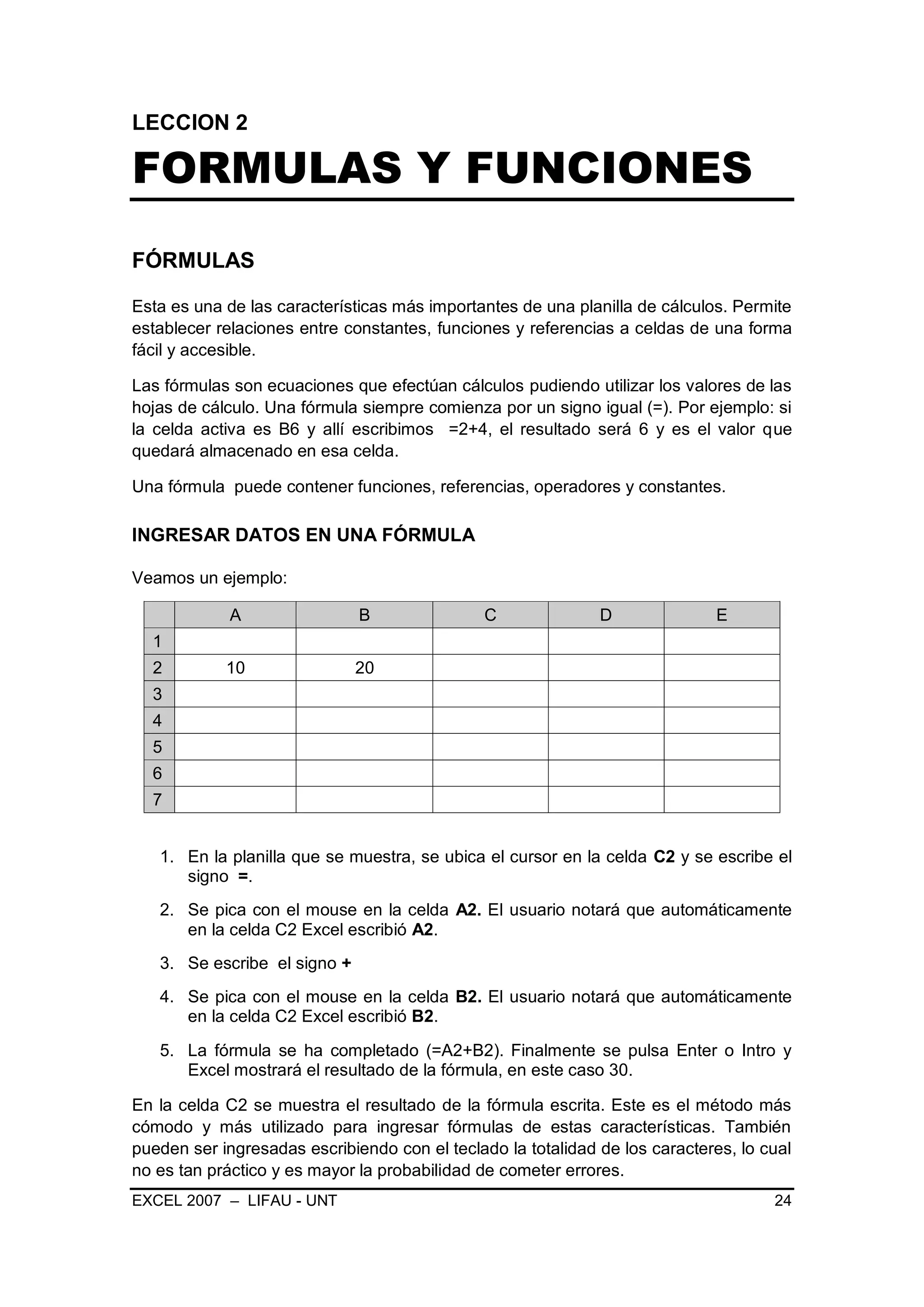Este documento describe fórmulas y funciones en Excel. Explica que las fórmulas permiten establecer relaciones entre celdas usando operadores, funciones y referencias. También describe cómo ingresar datos en una fórmula usando referencias de celdas y cómo modificar fórmulas. Finalmente, explica que las funciones son fórmulas predefinidas que facilitan cálculos usando valores específicos llamados argumentos.