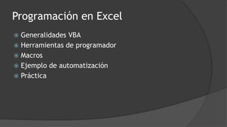 Este documento describe la programación en Excel usando VBA. Introduce las generalidades de Excel y su uso como herramienta de análisis numérico. Explica cómo VBA permite extender la funcionalidad de Excel creando macros. Proporciona instrucciones para activar las herramientas de programación en Excel y da ejemplos de cómo crear macros para automatizar tareas como calcular el promedio de una columna de datos. Finalmente, propone algunas prácticas para crear macros que resuelvan ecuaciones y creen tablas estadísticas.