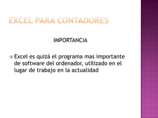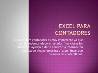 El Excel es una herramienta importante para los contadores ya que permite elaborar estados financieros que proporcionan información básica sobre una empresa. El documento muestra cómo se elaboraron los estados financieros iniciales de la empresa YARUQUI S.A. usando Excel, incluyendo el estado de situación inicial, libro diario y mayorización.