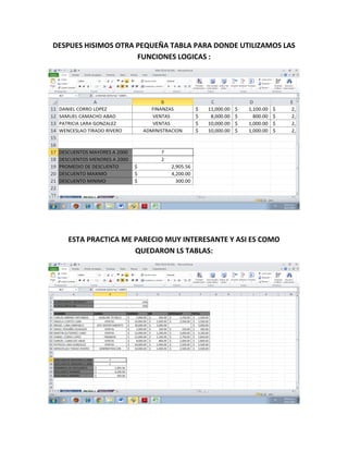 La práctica #3 involucró crear una tabla en Excel para registrar los datos de los empleados como nombre, ganancias, descuentos y cargo. Se llenó la tabla con la información de cada empleado y los porcentajes de descuento de INFONAVIT e ISR provistos. Se utilizaron fórmulas como =(C8*$C$2) para calcular los descuentos individuales y repetir este proceso para todos los empleados y obtener un total. Adicionalmente, se creó otra tabla pequeña usando funciones lógicas.