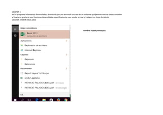 Este documento contiene una lista de 37 lecciones sobre el uso del programa Excel. Las lecciones cubren temas como abrir Excel, navegar entre celdas, formato de celdas, inserción de gráficos, uso de funciones y fórmulas, y creación de organigramas. Al final, el autor agradece al instructor y afirma que el método de enseñanza fue efectivo ya que le permitió adquirir una variedad de conocimientos sobre Excel.