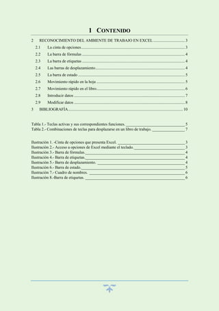 Este documento describe los elementos principales del entorno de trabajo en Excel, incluyendo la cinta de opciones, las barras de herramientas, y métodos para moverse dentro de hojas y libros de trabajo. Explica cómo introducir y modificar datos en celdas usando la barra de fórmulas, así como técnicas de movimiento rápido dentro de hojas usando teclas de dirección o nombres de celdas. El documento también incluye tablas con combinaciones de teclas para desplazarse.