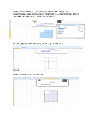 El documento describe los pasos para crear un juego de triqui en una hoja de cálculo. Estos incluyen seleccionar una cuadrícula y establecer el tamaño de fuente, centrar el texto en las celdas, colocar los datos de jugador X y O en las celdas A20 y A21, seleccionar las celdas correspondientes, e incluir una fórmula para determinar el ganador. También se menciona agregar una imagen recortada de una consola de videojuegos al tablero de triqui.