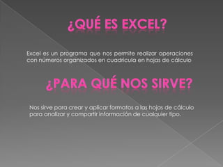 Excel es un programa de hojas de cálculo que permite organizar y analizar datos en cuadrículas. Nos permite crear tablas, gráficos, y realizar cálculos. Word es un procesador de texto que se utiliza para crear y editar documentos de forma sencilla, incluyendo funciones como corrección ortográfica y de búsqueda y reemplazo. Ambos programas son útiles para organizar y compartir información.