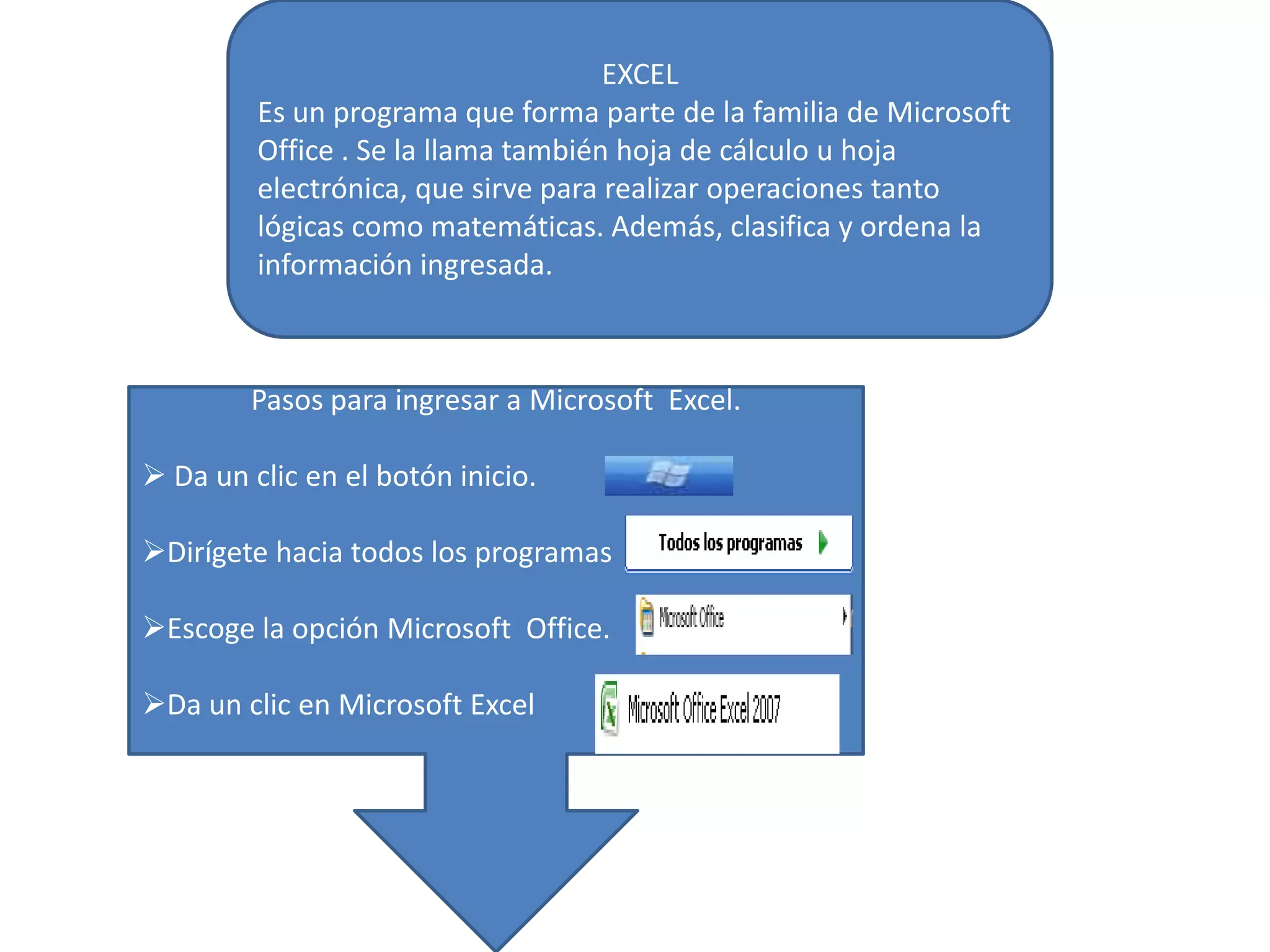 Excel es un programa de hoja de cálculo que forma parte de Microsoft Office. Permite realizar cálculos matemáticos e ingresar información en celdas organizadas en filas y columnas dentro de libros y hojas. Ofrece funciones como sumar, restar, multiplicar y dividir celdas, crear gráficos estadísticos de los datos, e insertar y ordenar filas y columnas.