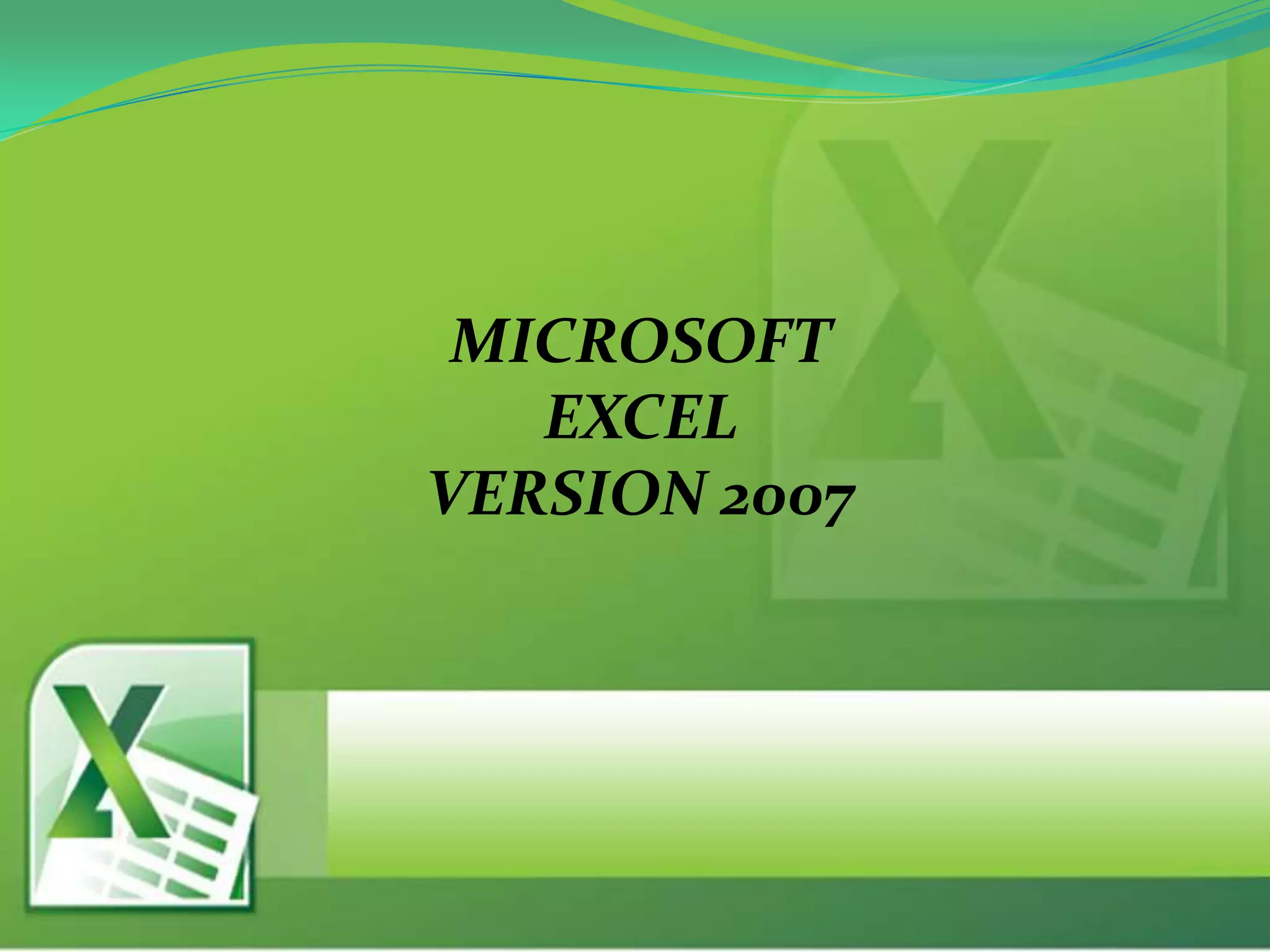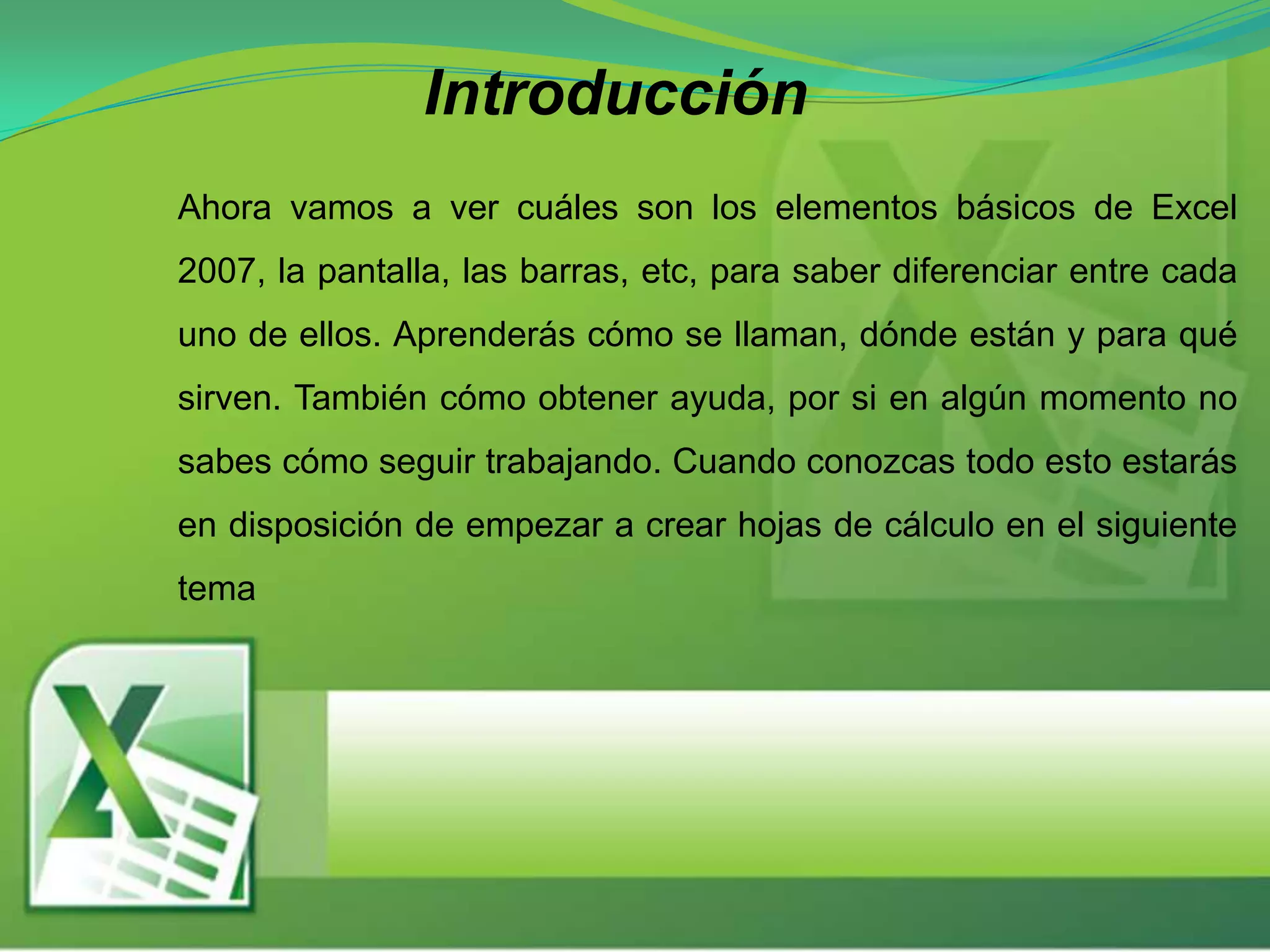 Este documento proporciona una introducción a los elementos básicos de Microsoft Excel 2007, incluyendo cómo iniciar el programa, el entorno de trabajo y las barras y herramientas principales como la barra de título, barra de fórmulas, barra de acceso rápido y barras de desplazamiento. El objetivo es familiarizar a los usuarios con la interfaz de Excel para que puedan empezar a crear hojas de cálculo.