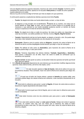 Este documento proporciona instrucciones sobre cómo dar formato a celdas en Excel 2007, incluida la fuente, alineación, bordes y rellenos. Explica que Excel permite cambiar el aspecto de los datos para resaltar la información clave. Luego describe las opciones de formato disponibles en la pestaña de formato de celdas y en la cinta de opciones para modificar rápidamente la fuente, alineación, bordes y rellenos de las celdas seleccionadas.