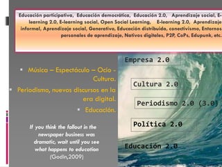 El documento aborda la transformación de la educación en la era digital, centrándose en conceptos como el aprendizaje conectivista, la educación 2.0 y la importancia de las comunidades de aprendizaje. Se destacan nuevos modelos de enseñanza que desafían las estructuras tradicionales, promoviendo el aprendizaje informal y colaborativo, así como la relevancia de la autenticidad y la personalización en el proceso educativo. Asimismo, se menciona el impacto de las tecnologías emergentes y la descentralización del conocimiento, que llevan a una mayor diversidad y a la necesidad de adaptarse a una economía de la atención.