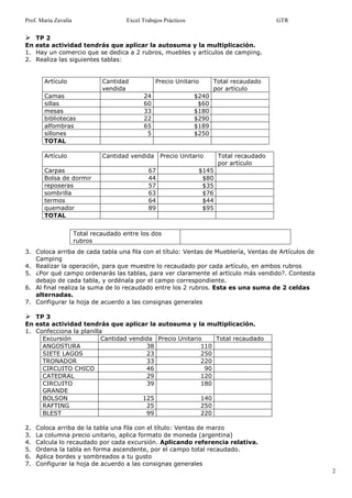 Este documento presenta las consignas generales para los trabajos prácticos de Excel. Se detallan los requisitos de formato y organización de archivos. Además, se enumeran los temas que se abordarán en los diferentes prácticos como funciones, formato condicional, operaciones entre celdas y uso de referencias relativas y absolutas. Finalmente, se describen las actividades específicas de cada práctico.